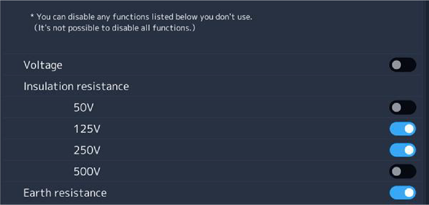 *Even when the voltage function is turned off, voltage can be measured while the insulation and earth resistance functions are in stand-by mode.