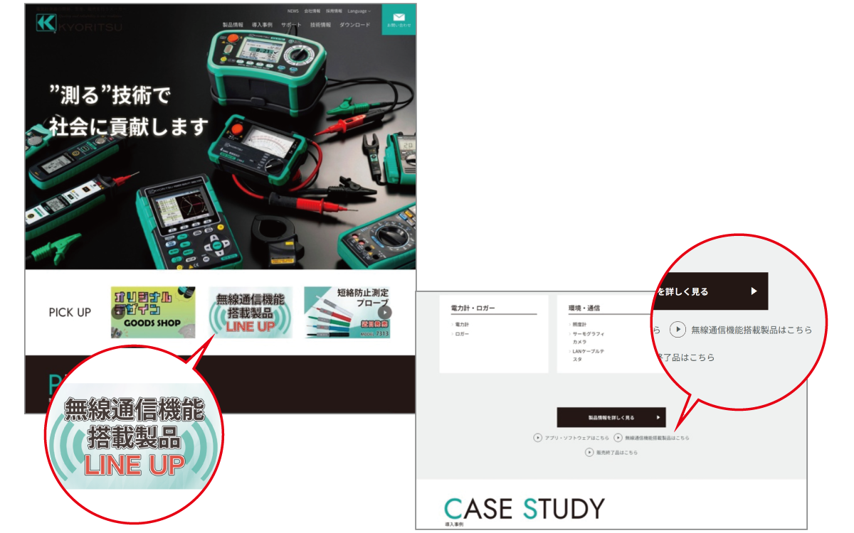 トップページから目的の製品へアクセス、遷移しやすいように、PICK UPバナーおよび製品情報内の「製品情報を詳しく見る」の下に、「無線通信機能搭載製品はこちら」のリンクを設置しました。