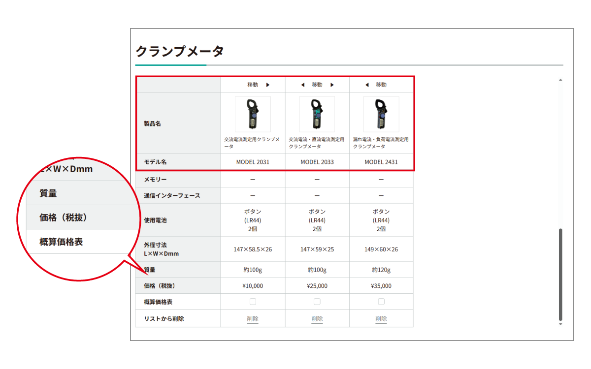 比較表の項目に「価格(税抜)」を追加しました。また、上下左右にスクロールしても、製品名・モデル名・項目が常に固定表示されるようにしました。