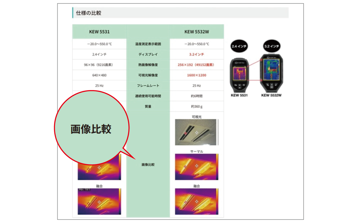 お客様の声 製品比較がしたくて訪れましたが、性能の数値は比較できたものの、実画像の比較があるのかわからなかった。同じ観測物を撮影した画像の比較が見たい。 改善 サーモグラフィカメラ紹介ページの仕様欄に、画像比較のためのエリアを追加しました。各製品ページで紹介している画像を横並びで比較できるようになりましたので、ぜひご活用ください。