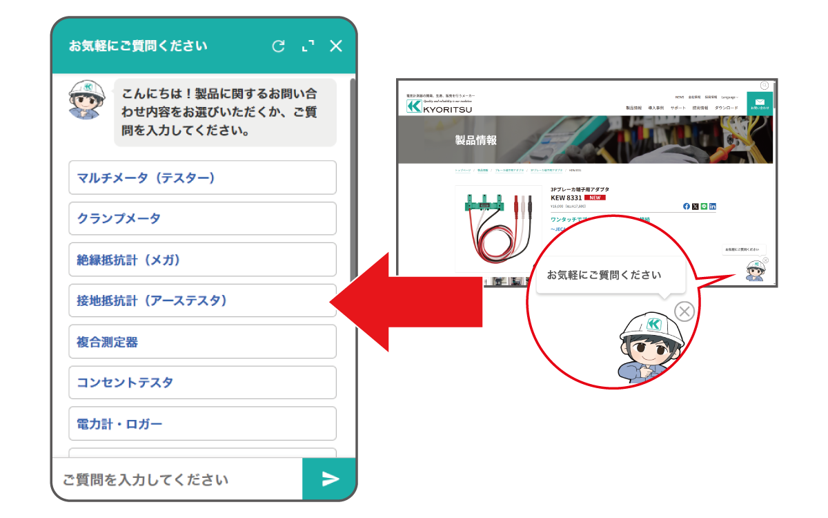 お客様の声 AIチャット機能をつけてほしい 改善 製品ページやお問い合わせページの右下に、ヘルメットを着用したキャラクターKさんを表示しました。イラストをクリックするとチャットボットが起動し、ご質問やお困りごとにお答えします。ぜひご利用ください。 ※トップページ、会社情報、採用情報ではチャットボットをご利用いただけません。